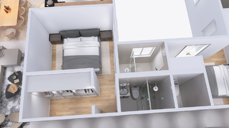 El segundo dormitorio cuenta con dos zonas de armarios y aseo en suite, perfecto para usos múltiples: habitación principal secundaria, dormitorio para invitados o espacio de trabajo con baño privado.