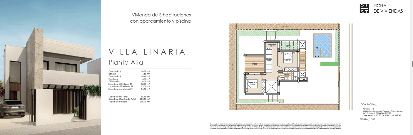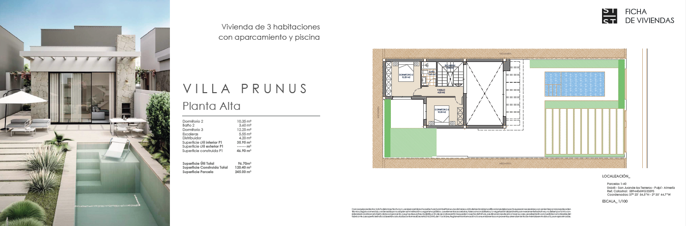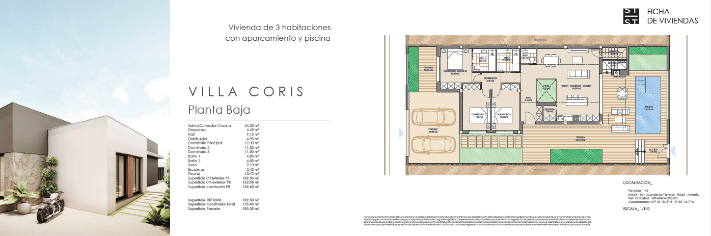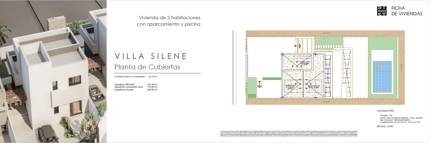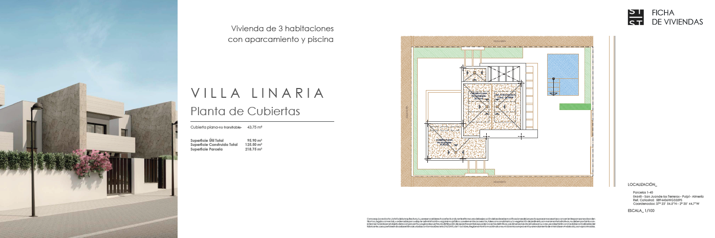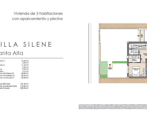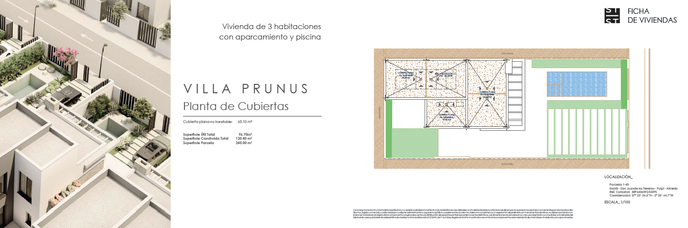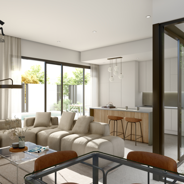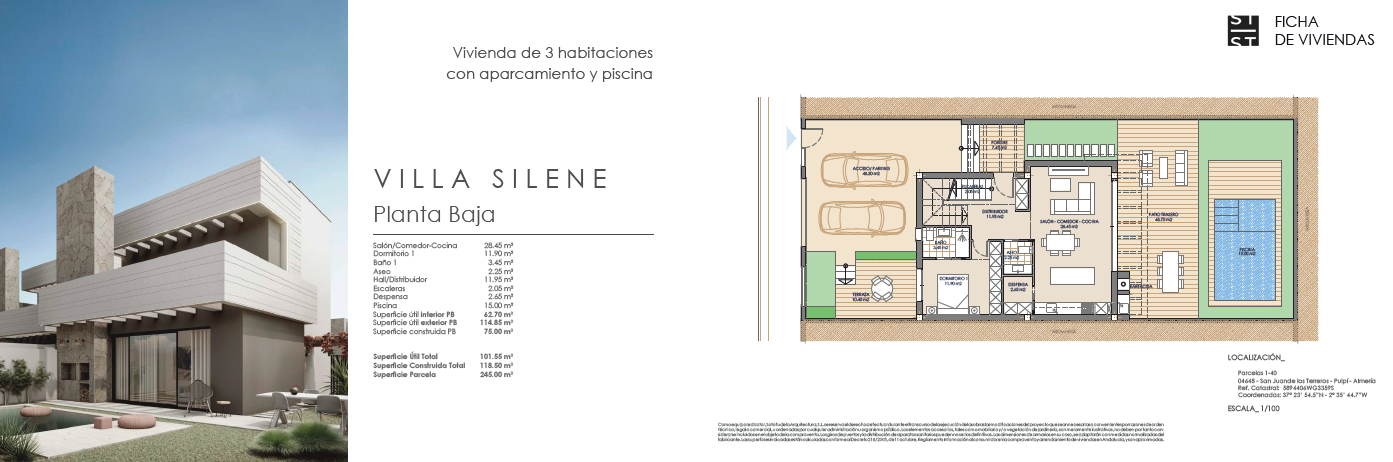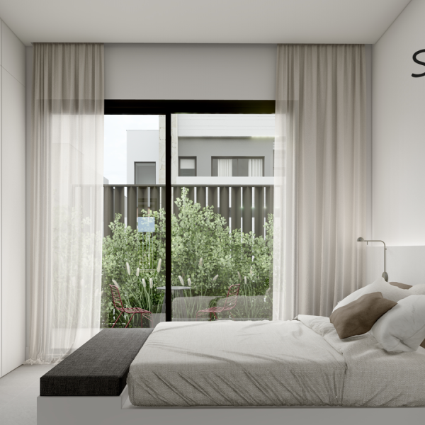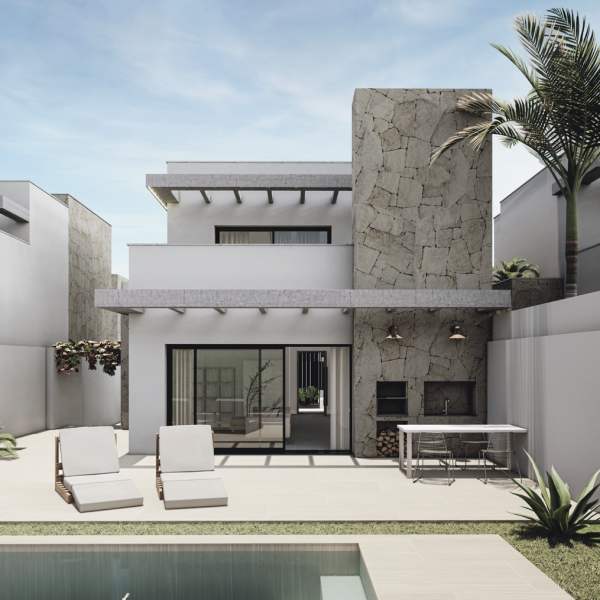 Las villas tienen desde 118 metros y todas constan de 3 habitaciones con aparcamiento y piscina. Sus distribuciones son de conceptos abiertos en los espacios comunes y están proyectadas para que la luz y la amplitud sean las protagonistas de estas viviendas.