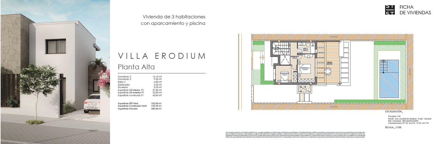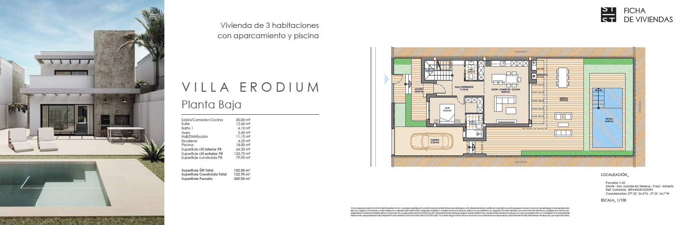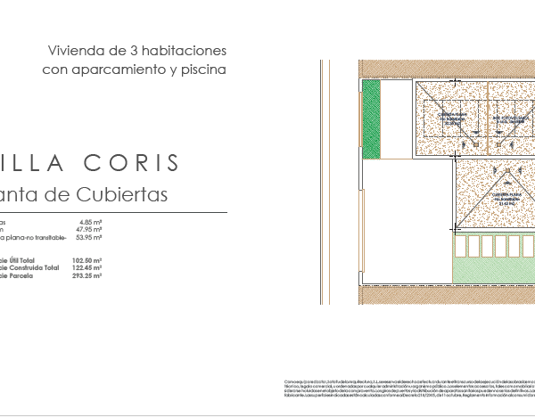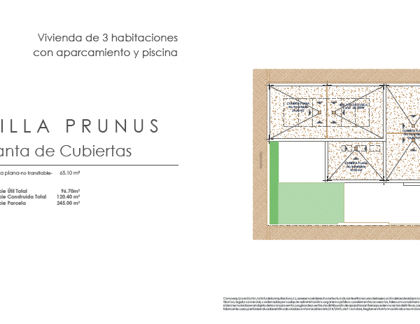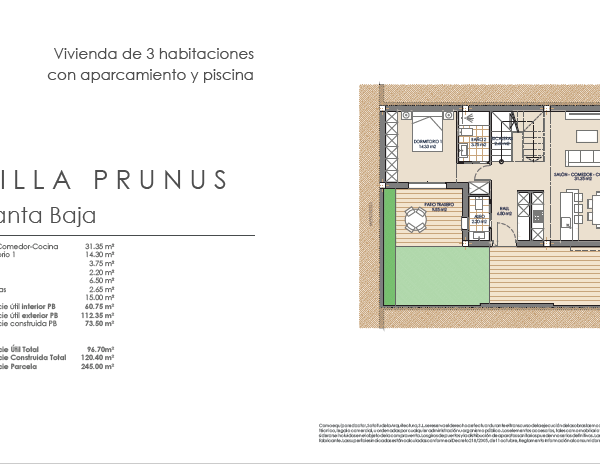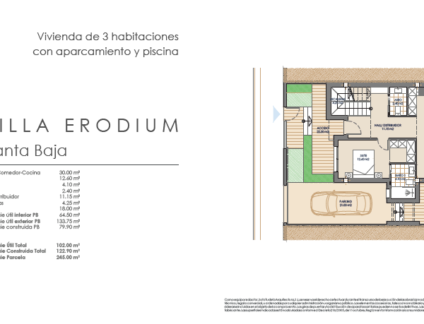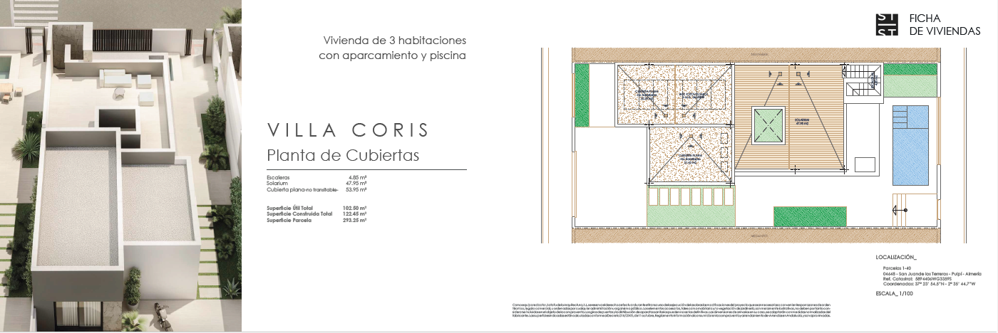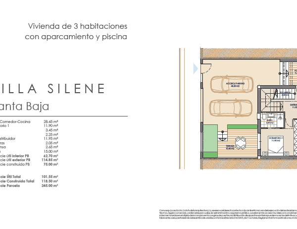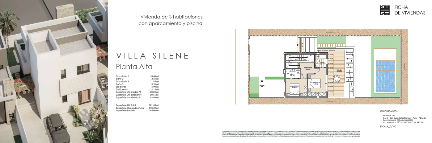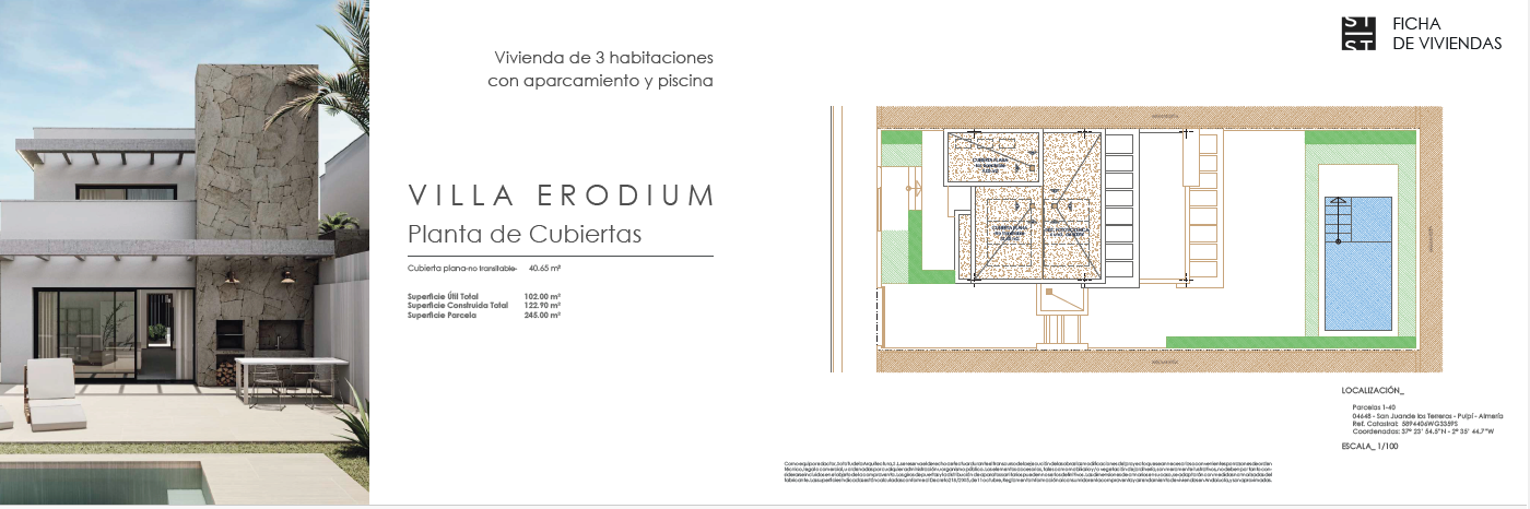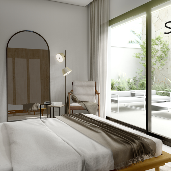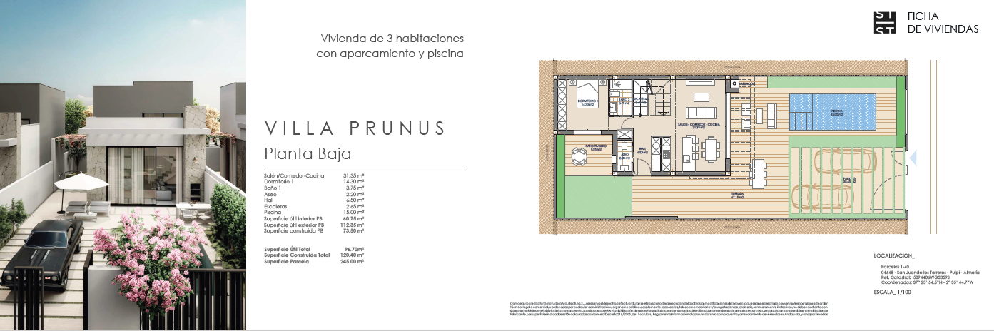 Las villas tienen desde 118 metros y todas constan de 3 habitaciones con aparcamiento y piscina. Sus distribuciones son de conceptos abiertos en los espacios comunes y están proyectadas para que la luz y la amplitud sean las protagonistas de estas viviendas.