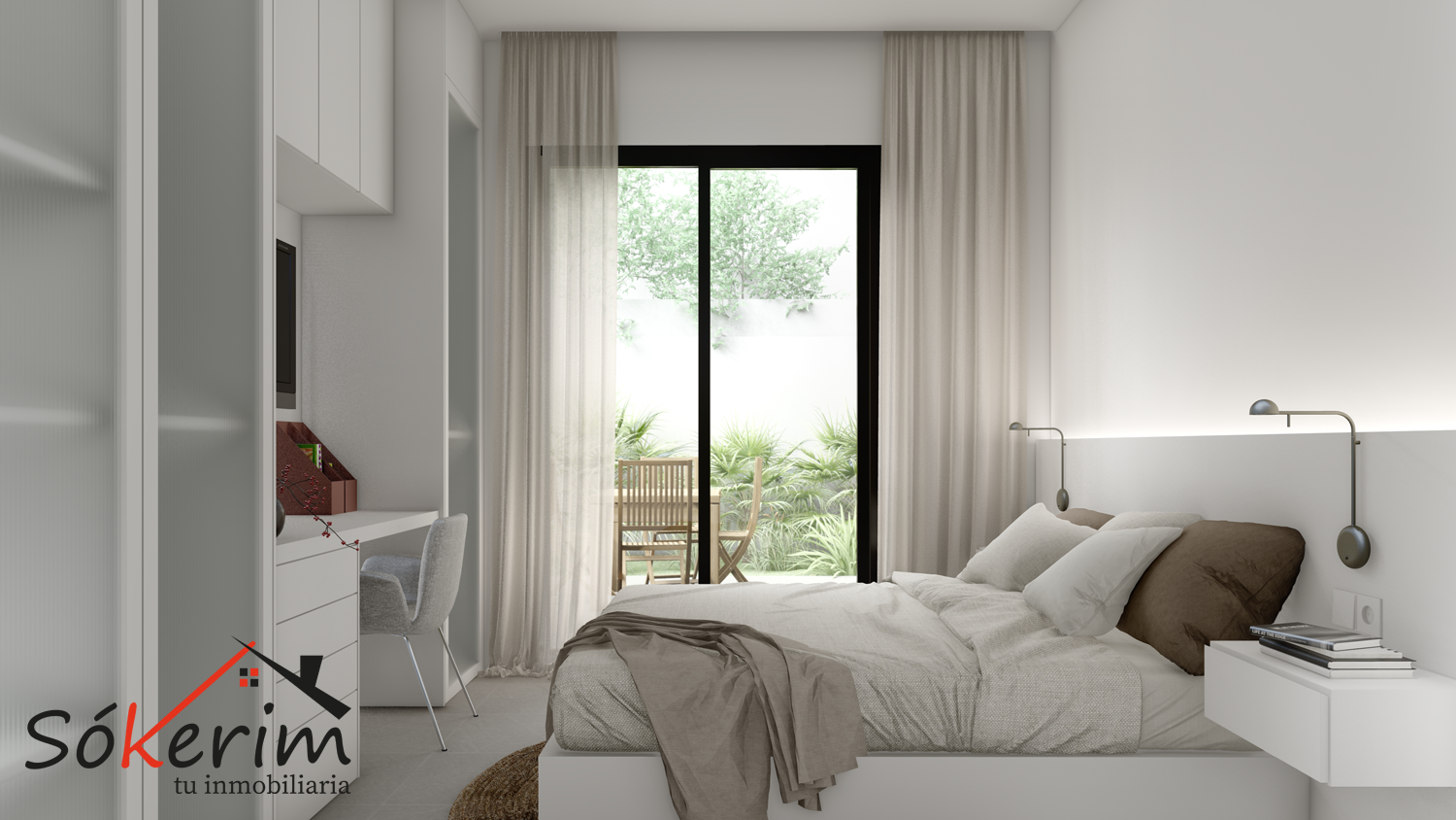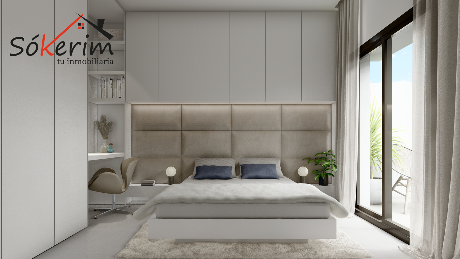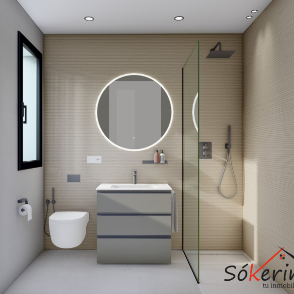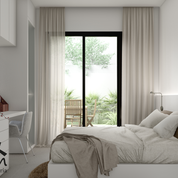 Cocina acabada en Blanco con encimeras porcelánicas y armarios empotrados en todos los dormitorios.